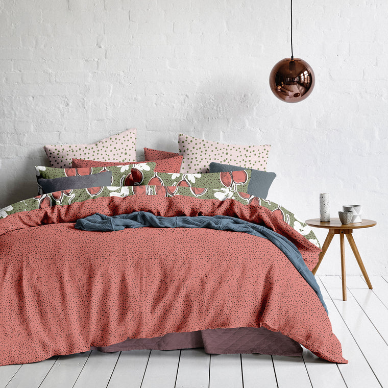 Seed pods in blue on shell pink linen